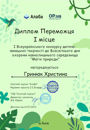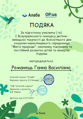 Освітній портал Алаба, за організаційної підтримки ТОВ «Освітній портал»ТМ https://op.ua запрошує до участі у І Всеукраїнському конкурсі дитячо-юнацької творчості до Всесвітнього дня охорони довкілля "Магія природи".