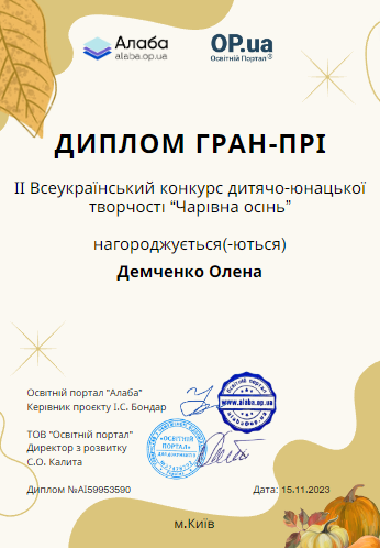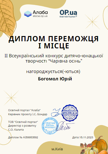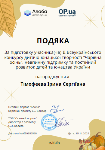 Освітній портал "Алаба", за організаційної підтримки ТОВ "Освітній портал"ТМ https://op.ua, запрошує до участі у ІІ Всеукраїнському конкурсі дитячо-юнацької творчості "Чарівна осінь".