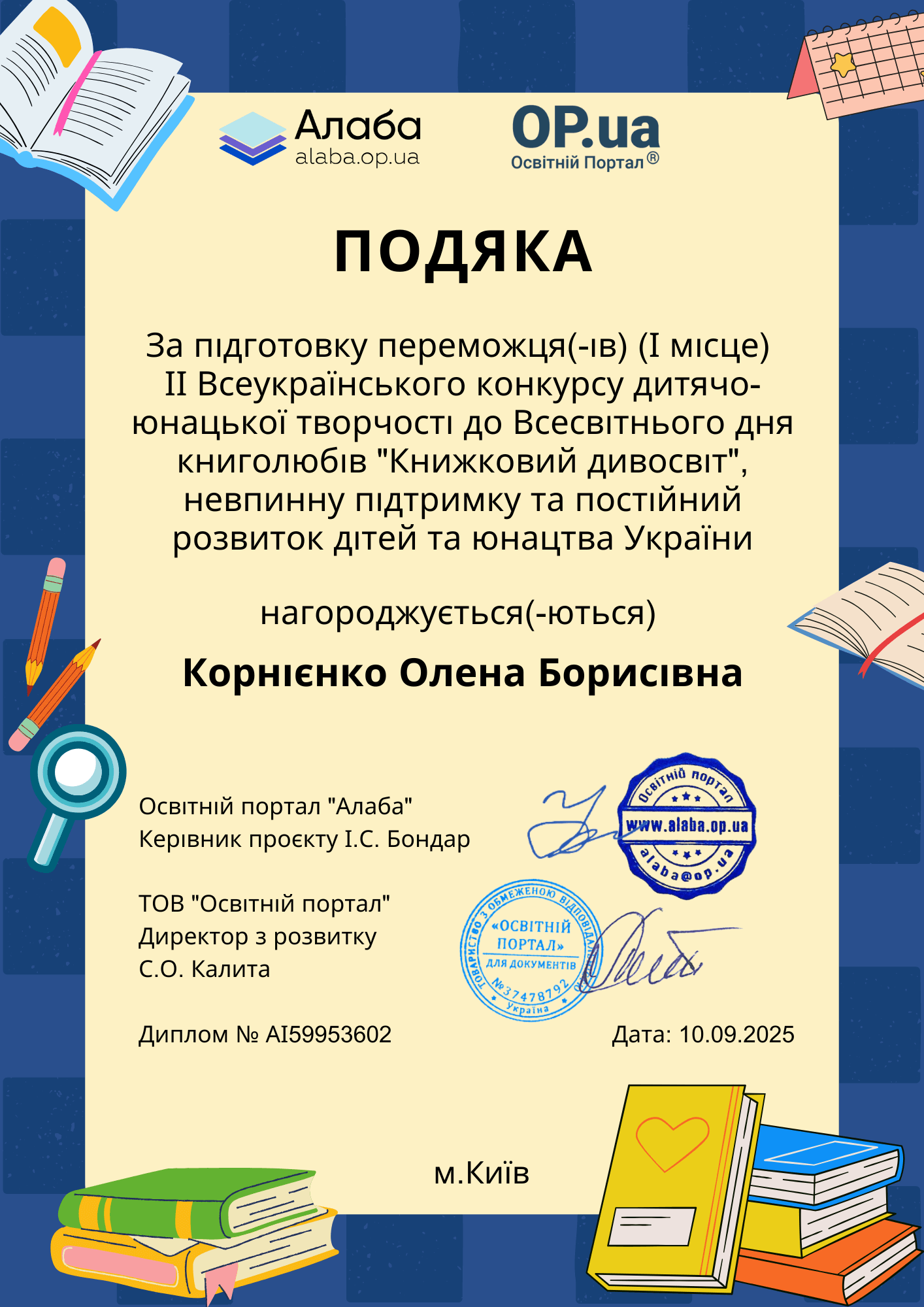 Освітній портал "Алаба", за організаційної підтримки ТОВ «Освітній портал»ТМ https://op.ua, запрошує до участі у ІІ Всеукраїнському конкурсі дитячо-юнацької творчості до Всесвітнього дня книголюбів "Книжковий дивосвіт".