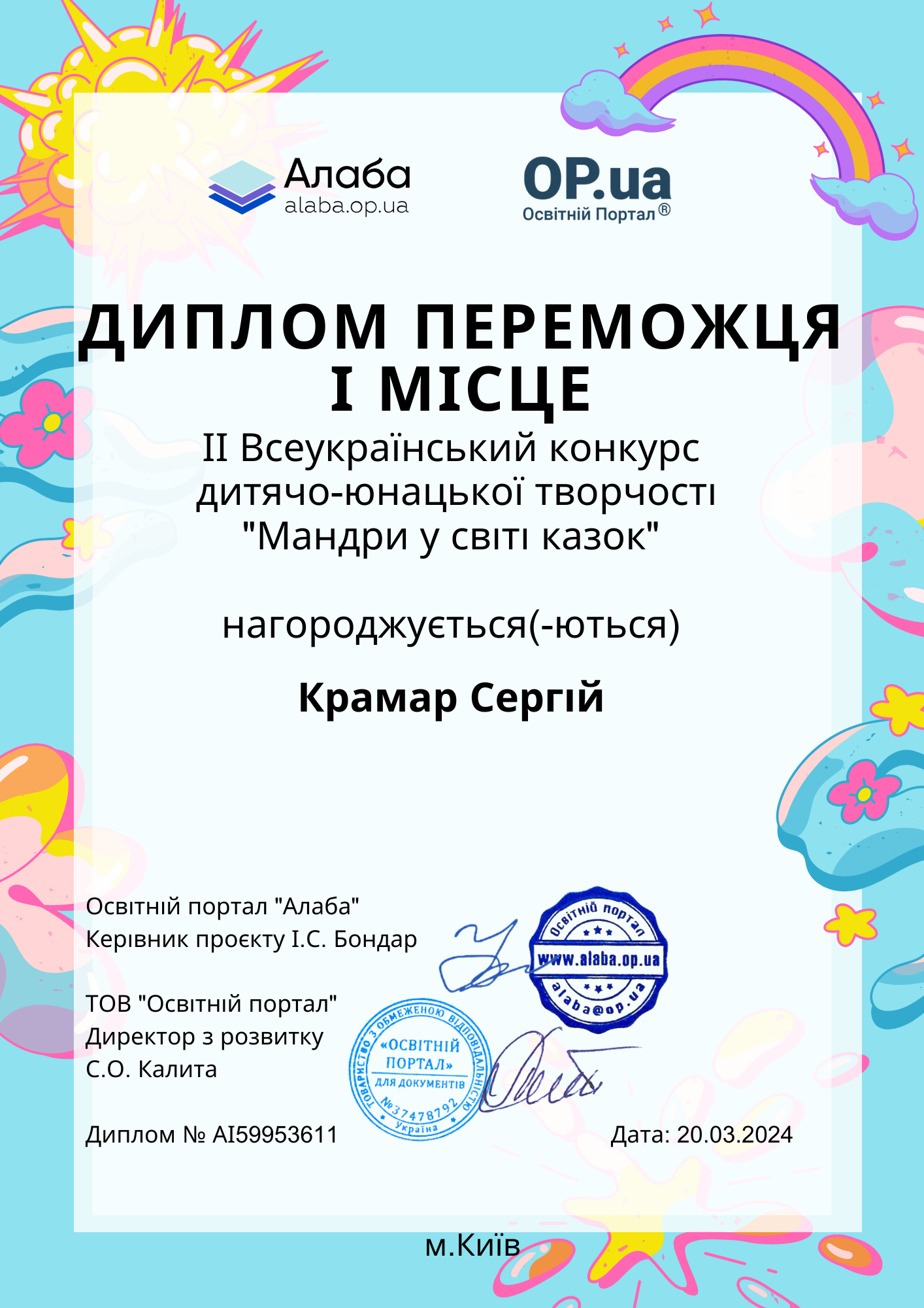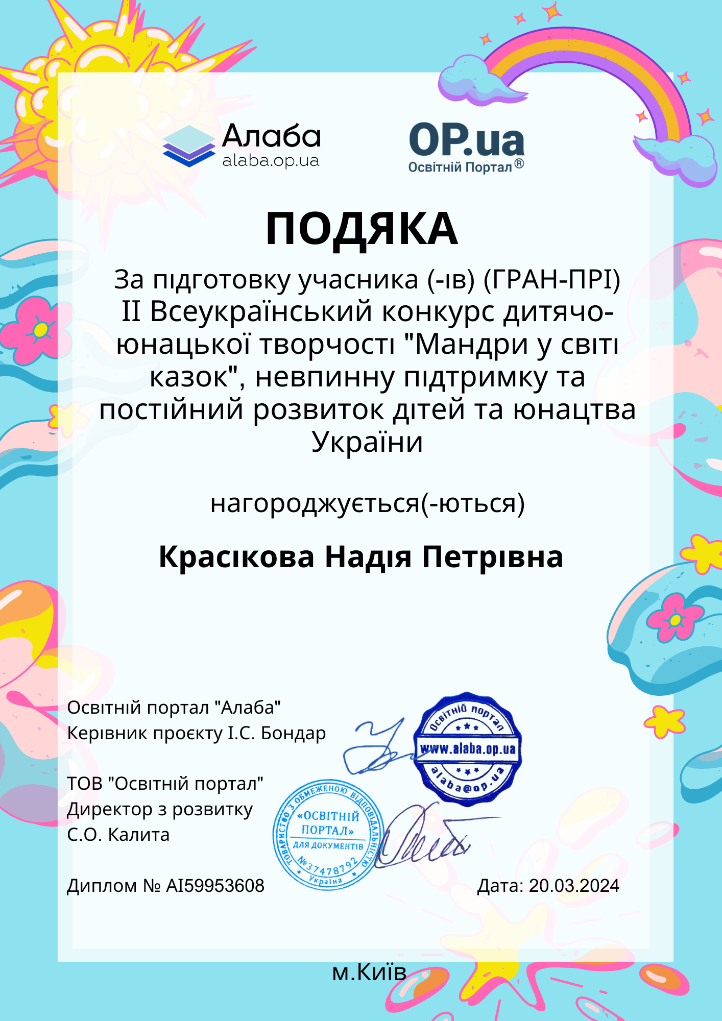 Освітній портал Алаба, за організаційної підтримки ТОВ «Освітній портал»ТМ https://op.ua, запрошує до участі у ІІ Всеукраїнському конкурсі дитячо-юнацької творчості "Мандри у світі казок".