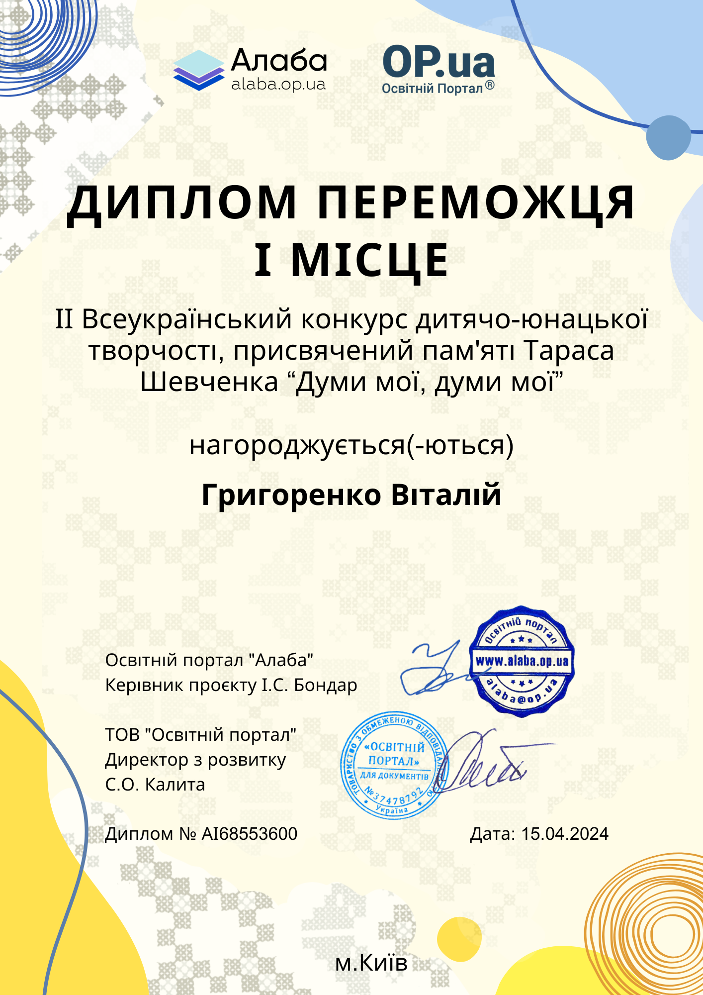 Диплом Переможця (І, ІІ та ІІІ місце)