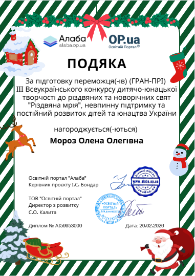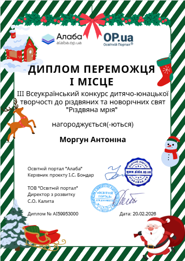 Освітній портал Алаба, за організаційної підтримки ТОВ «Освітній портал»ТМ https://op.ua, запрошує до участі у ІІI Всеукраїнському конкурсі дитячо-юнацької творчості до різдвяних та новорічних свят "Різдвяна мрія".