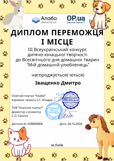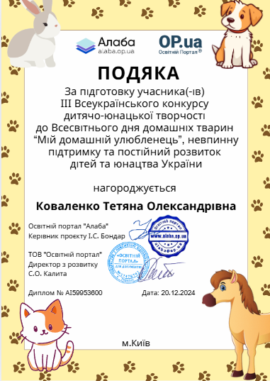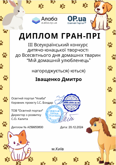 Освітній портал "Алаба", за організаційної підтримки ТОВ «Освітній портал»ТМ https://op.ua, запрошує до участі у ІІІ Всеукраїнському конкурсі дитячо-юнацької творчості до Всесвітнього дня домашніх тварин "Мій домашній улюбленець".