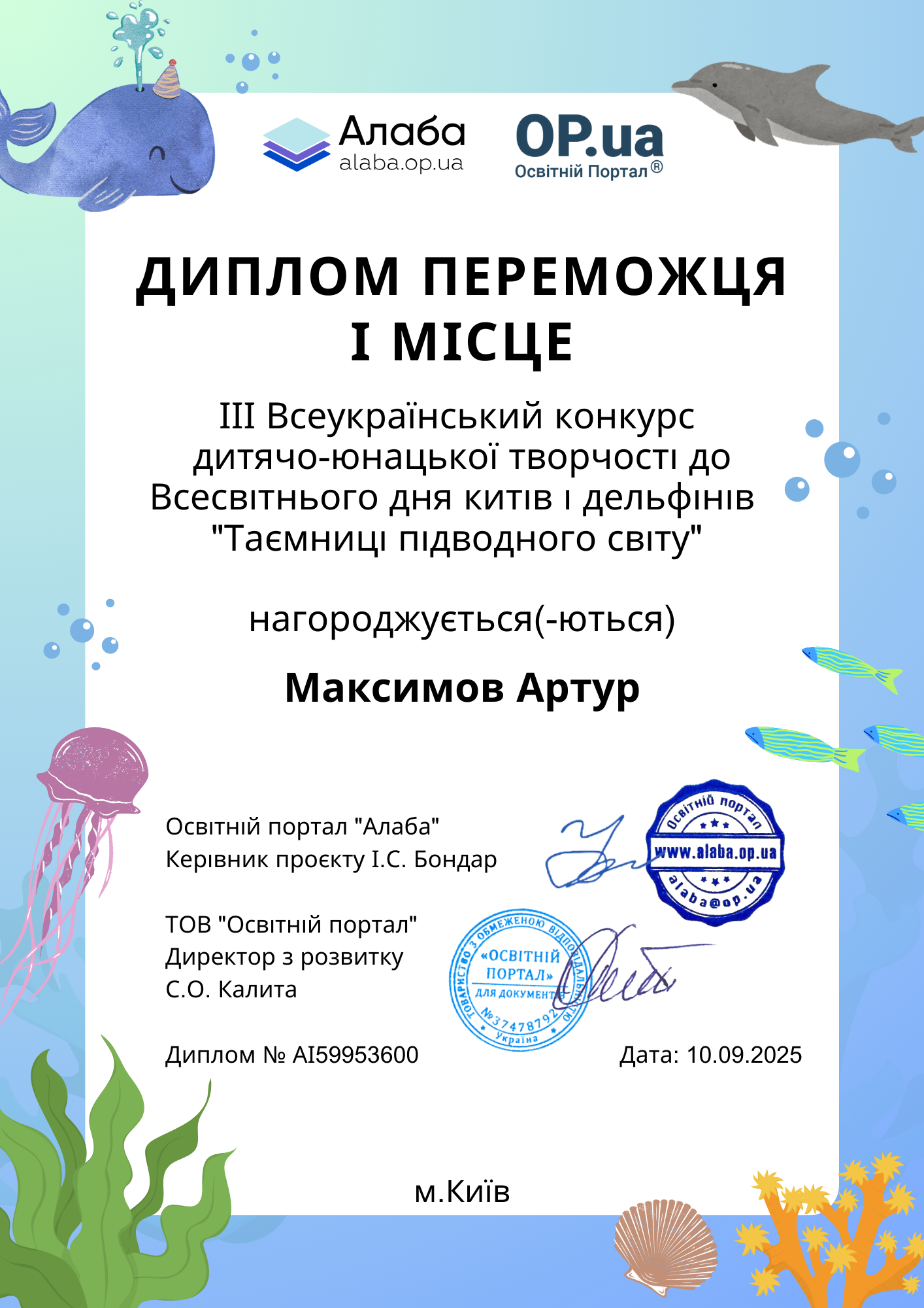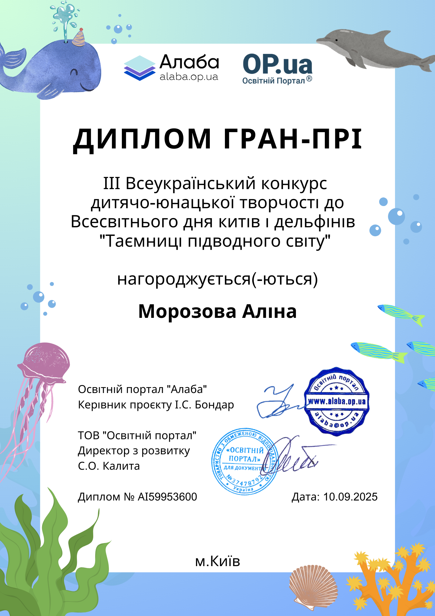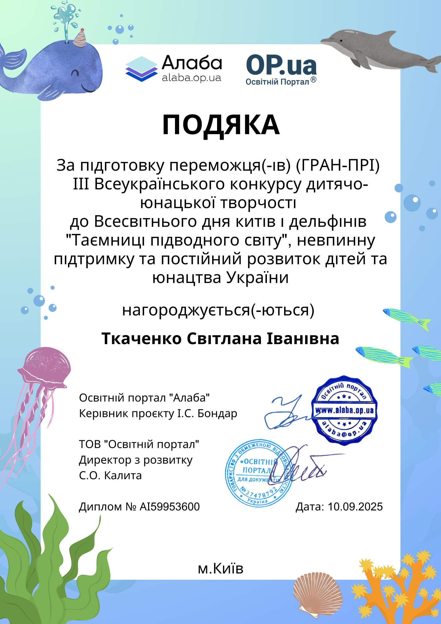 Освітній портал "Алаба", за організаційної підтримки ТОВ "Освітній портал"ТМ, запрошує до участі у ІІІ Всеукраїнському конкурсі дитячо-юнацької творчості до Всесвітнього дня китів і дельфінів "Таємниці підводного світу".