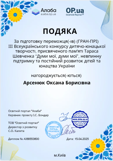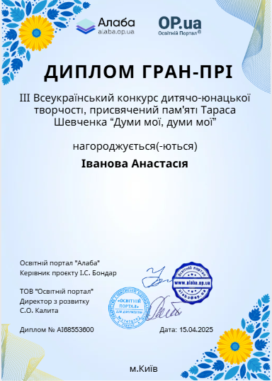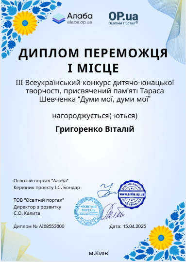 Освітній портал "Алаба", за організаційної підтримки ТОВ «Освітній портал»ТМ https://op.ua, запрошує до участі у ІІІ Всеукраїнському конкурсі дитячо-юнацької творчості, присвяченому пам'яті Тараса Шевченка "Думи мої, думи мої".