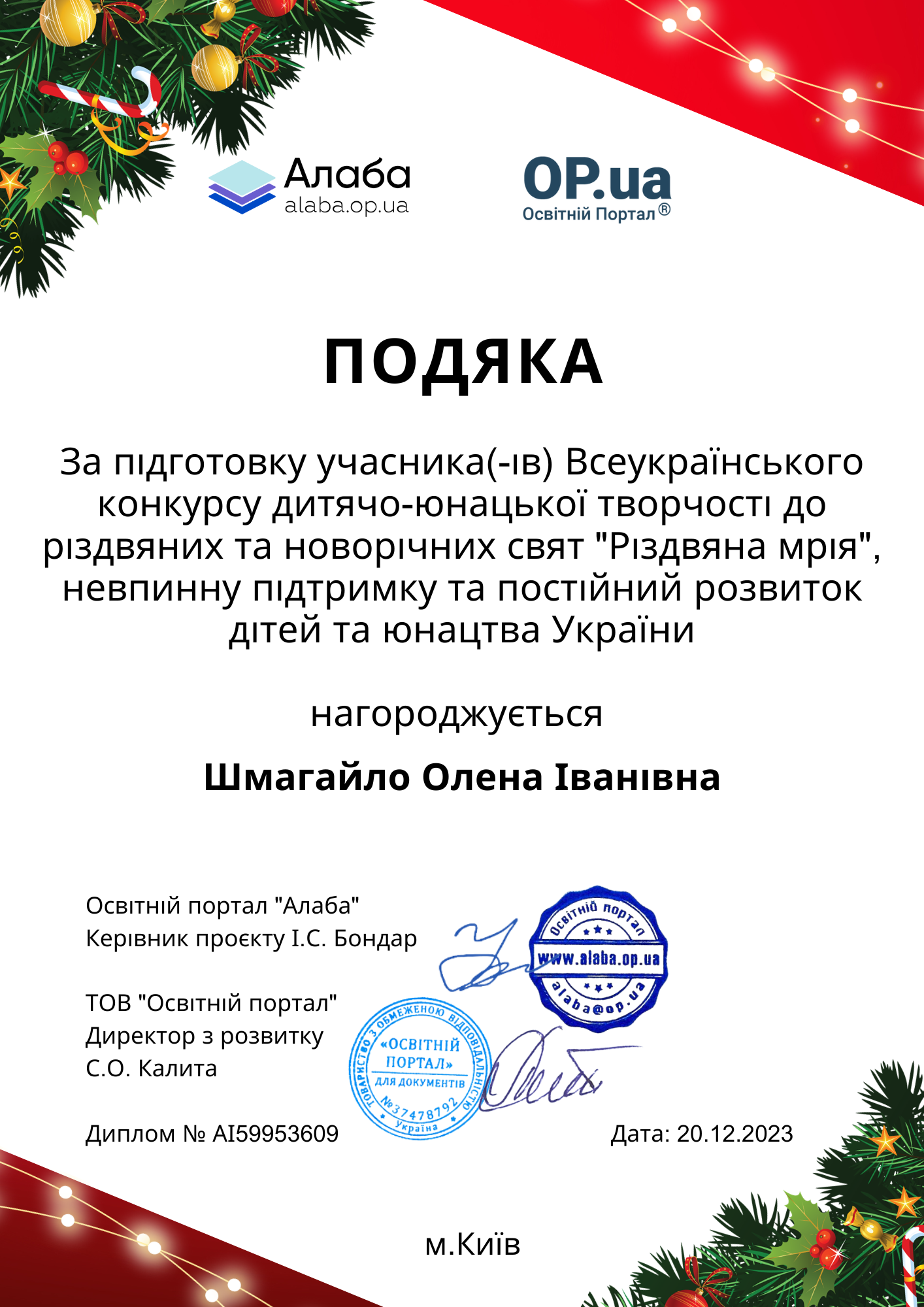 Освітній портал Алаба, за організаційної підтримки ТОВ «Освітній портал»ТМ https://op.ua, запрошує до участі у Всеукраїнському конкурсі дитячо-юнацької творчості до різдвяних та новорічних свят "Різдвяна мрія".