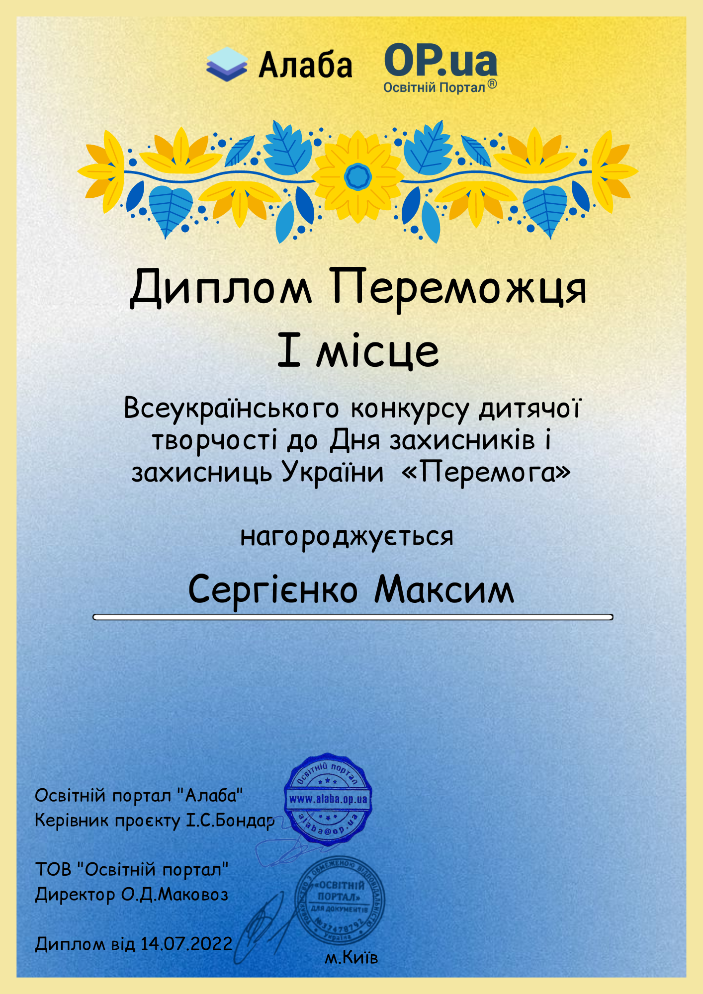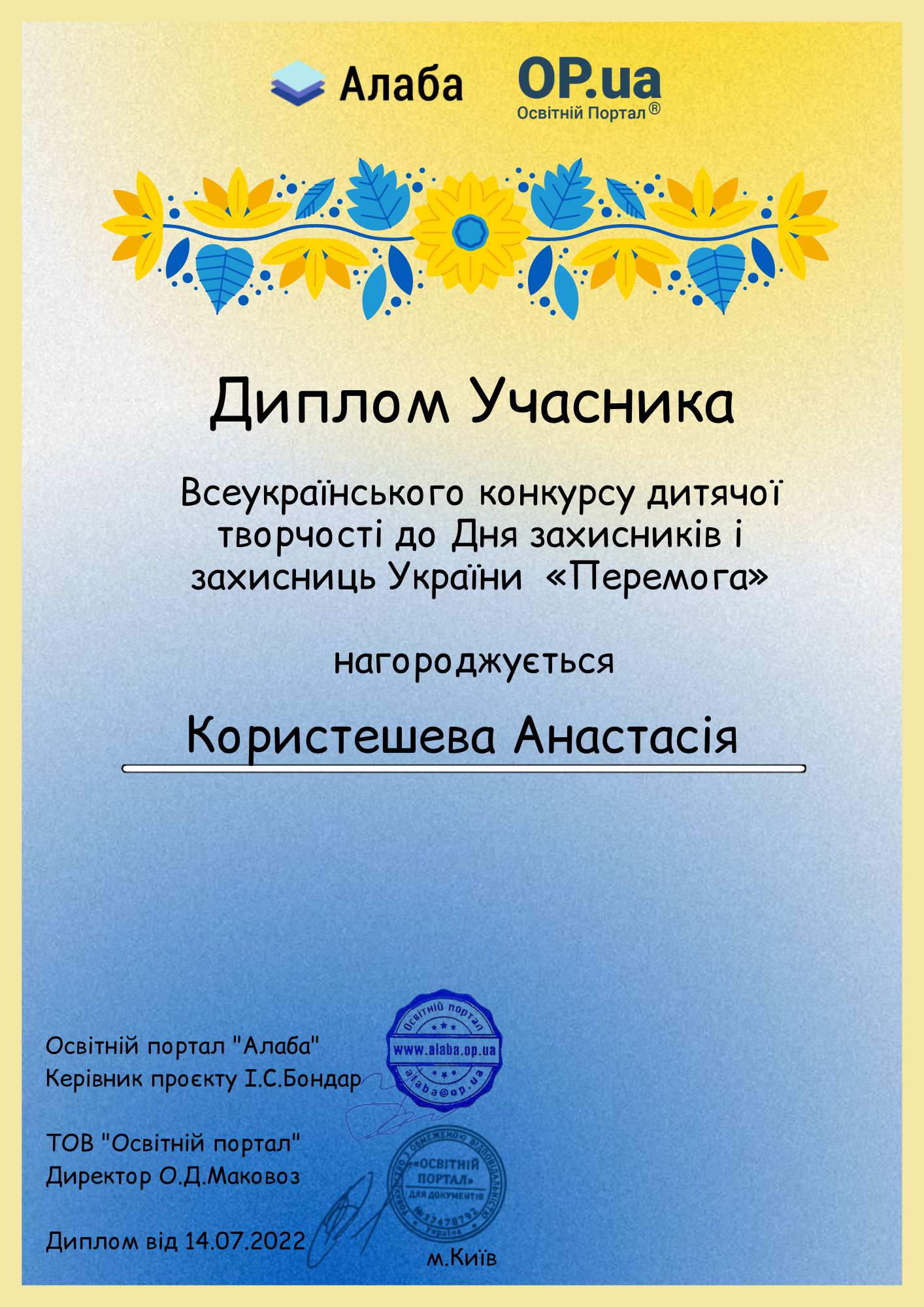 Освітній портал Алаба, за організаційної підтримки ТОВ «Освітній портал»ТМ https://op.ua, запрошує до участі у Всеукраїнському конкурсі дитячої творчості до Дня захисників і захисниць України "Перемога"