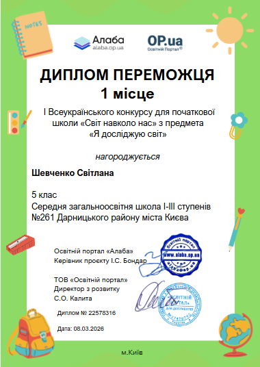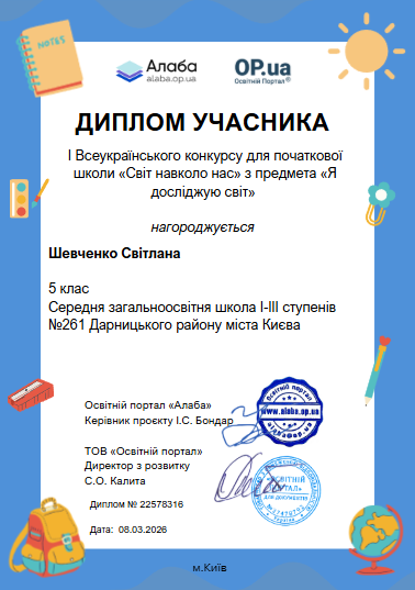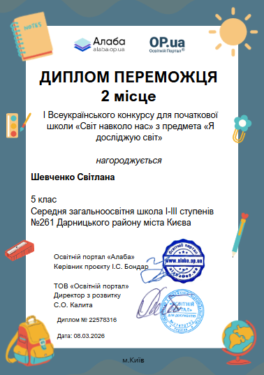 ▶️ Освітній портал «Алаба», за організаційної підтримки ТОВ «Освітній портал»ТМ https://op.ua , запрошує учнів 1-4 класів дистанційно взяти участь у I Всеукраїнському конкурсі для початкової школи «Світ навколо нас» з предмету «Я досліджую світ».