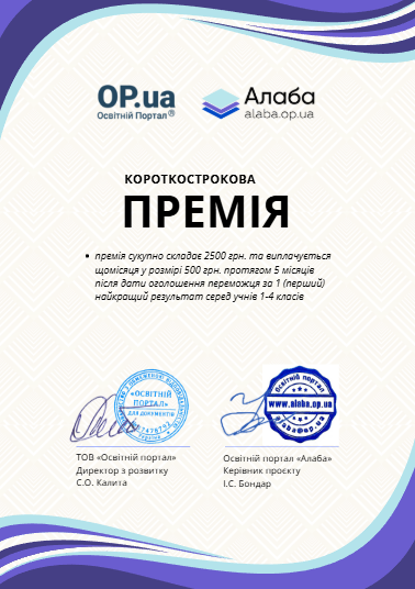 Короткострокова премія за 1 (перший) найвищий результат серед учнів 1-4 класів