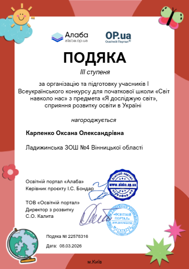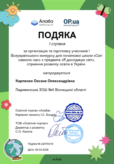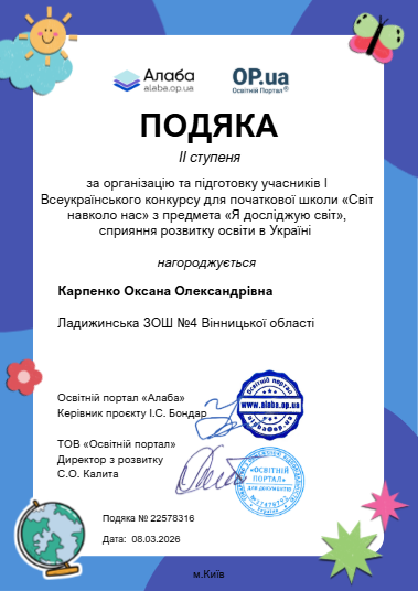 ▶️ Освітній портал «Алаба», за організаційної підтримки ТОВ «Освітній портал»ТМ https://op.ua , запрошує учнів 1-4 класів дистанційно взяти участь у I Всеукраїнському конкурсі для початкової школи «Світ навколо нас» з предмету «Я досліджую світ».
