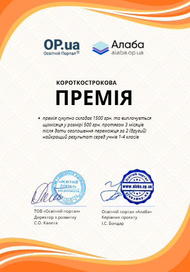 Короткострокова премія за 2 (другий) найвищий результат серед учнів 1-4 класів