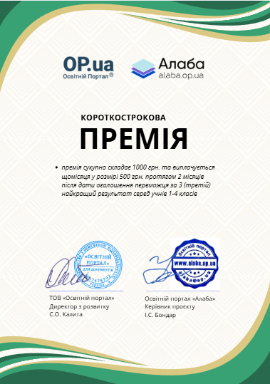 Короткострокова премія за 3 (третій) найвищий результат серед учнів 1-4 класів