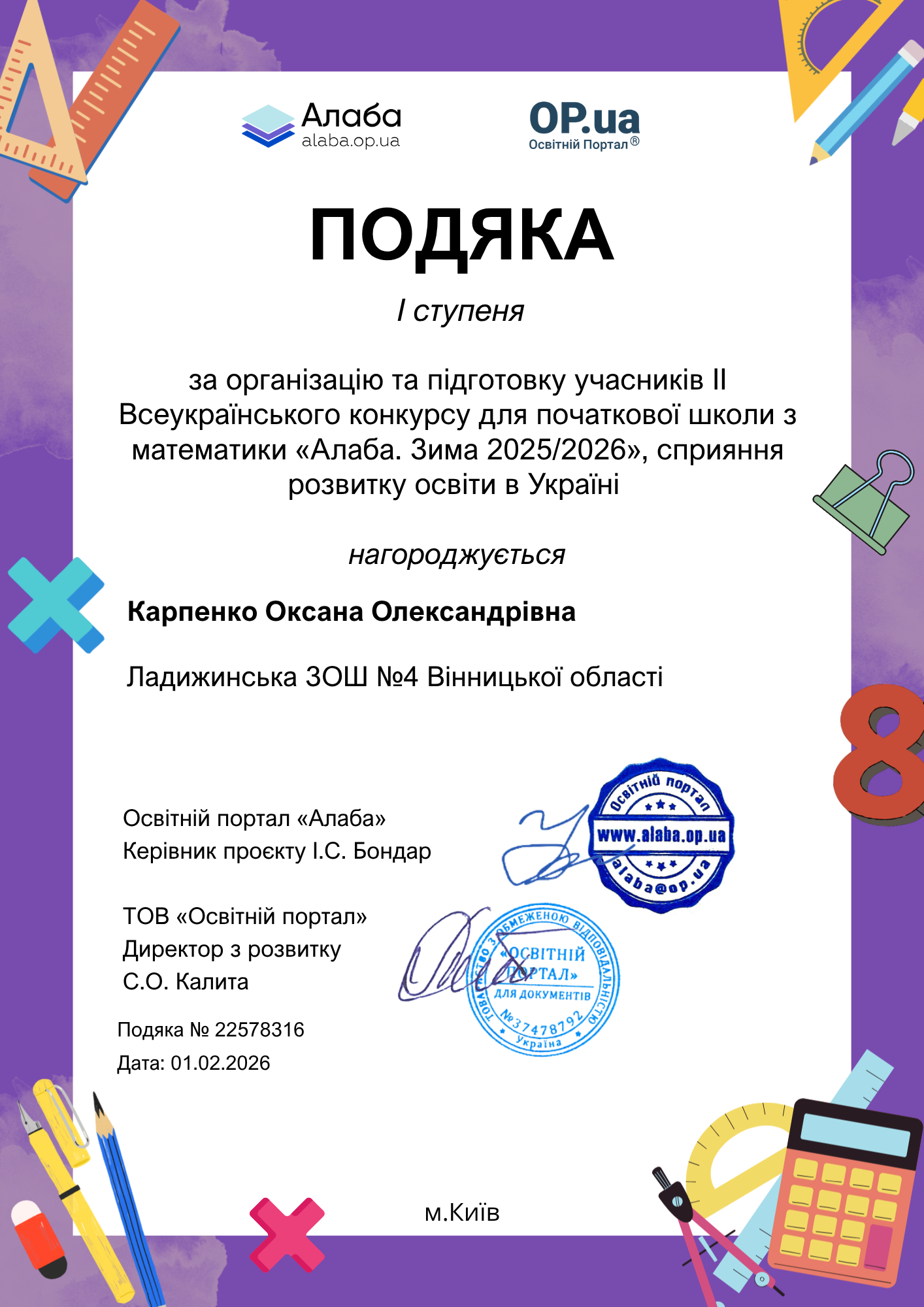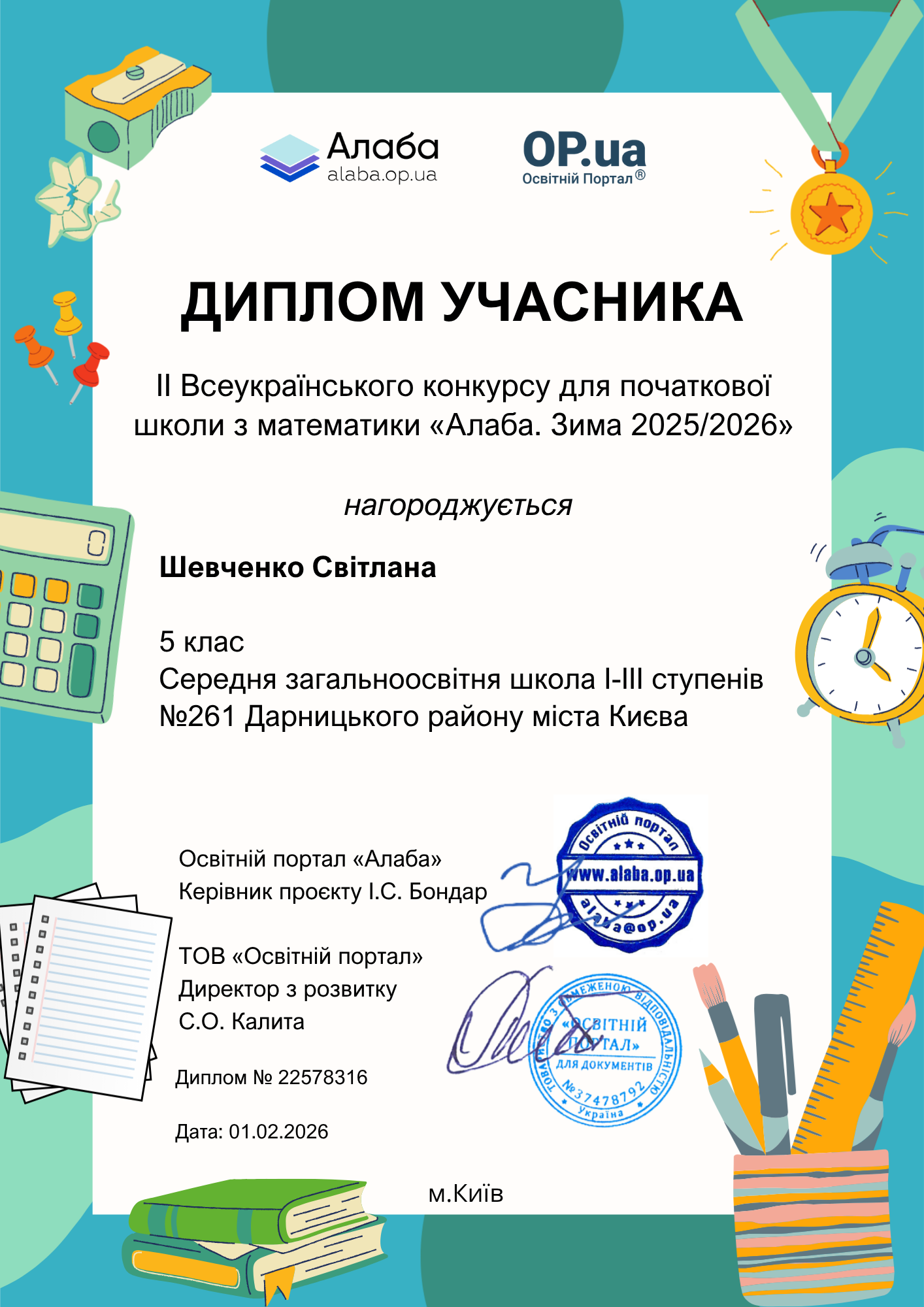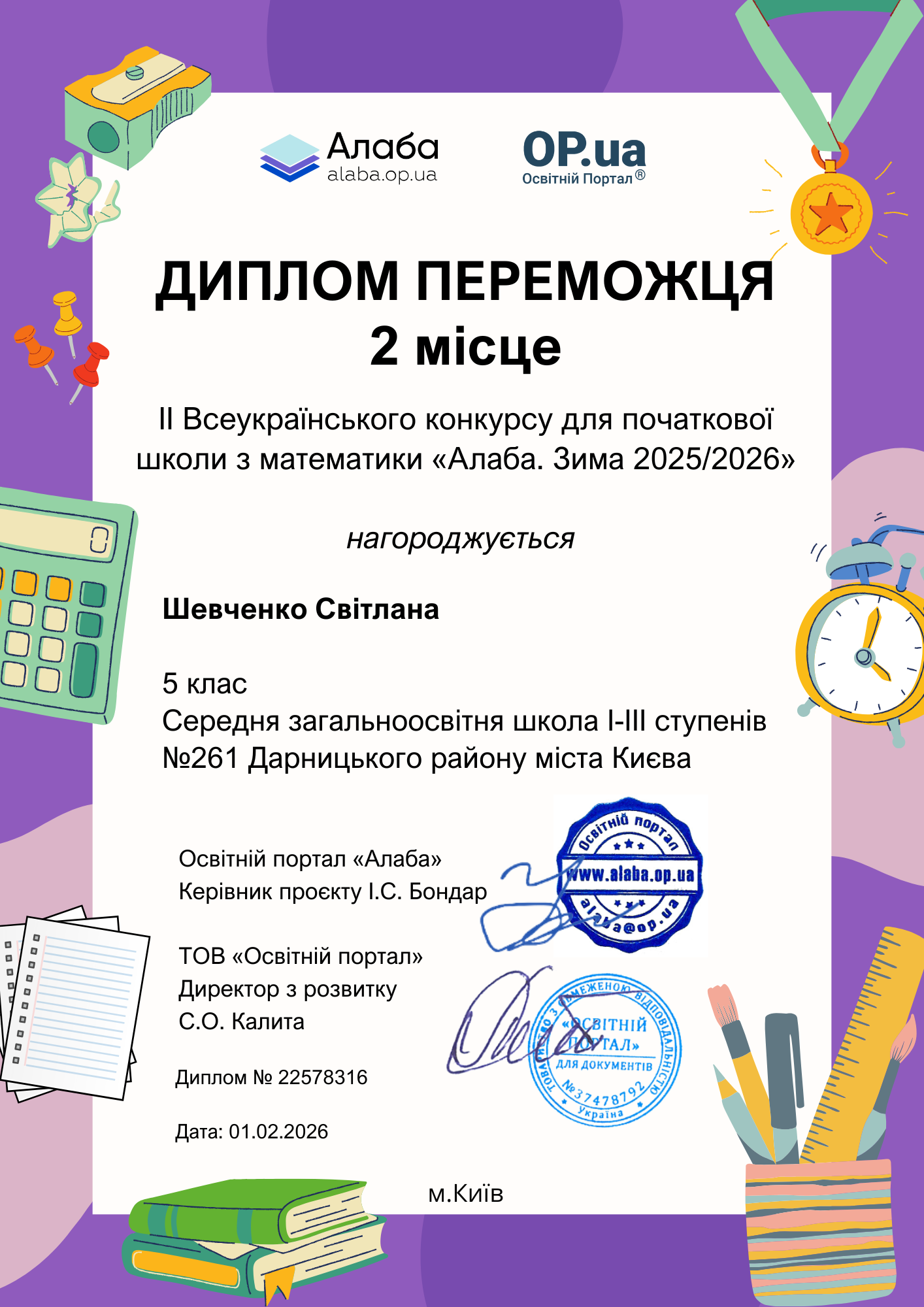 ▶️ Освітній портал «Алаба», за організаційної підтримки ТОВ «Освітній портал»ТМ https://op.ua , запрошує учнів 1-4 класів дистанційно взяти участь у ІІ Всеукраїнському конкурсі для початкової школи з математики «Алаба. Зима 2025/2026».