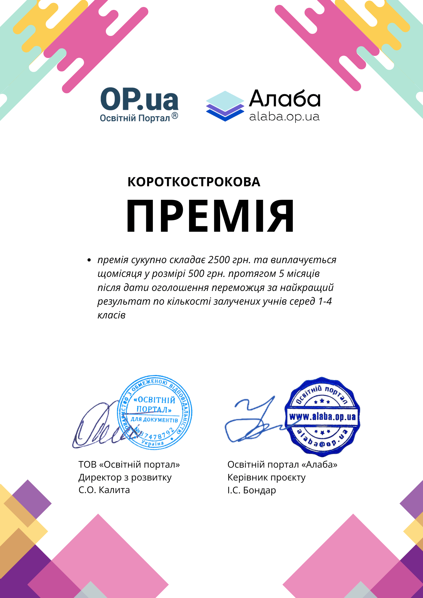 Короткострокова премія за 2 (другий) найвищий результат серед учнів 1-4 класів