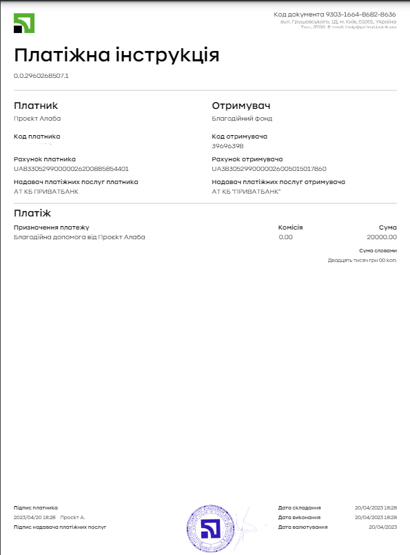 В рамках соціальної відповідальності, проєкт "Алаба", за допомогою учасників творчих та освітніх конкурсів, долучився до фінансової підтримки Сил оборони України. Частина організаційних (благодійних) внесків у розмірі 20 000 грн. була перерахована до БФ "Повернись живим".