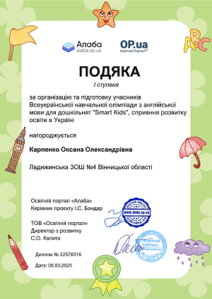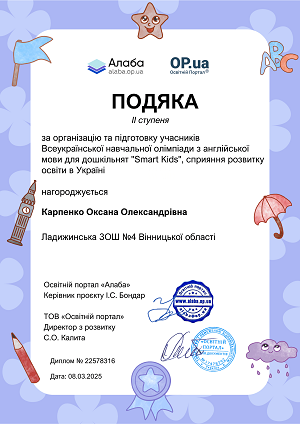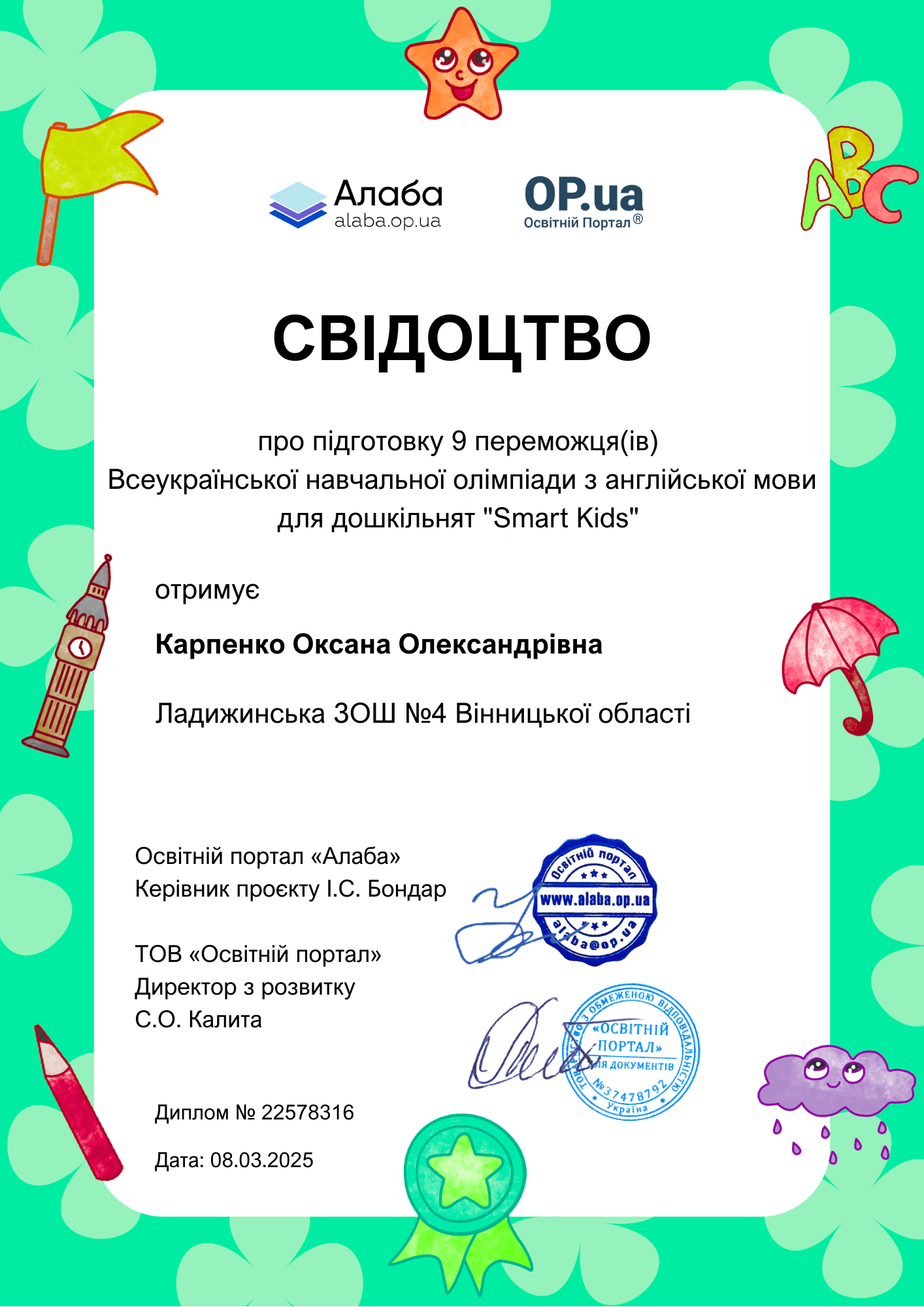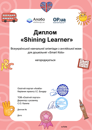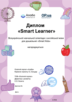 ▶️ Освітній портал «Алаба», за організаційної підтримки ТОВ «Освітній портал»ТМ https://op.ua , запрошує дошкільнят (5-7 років) дистанційно взяти участь у Всеукраїнській навчальній олімпіаді з англійської мови для дошкільнят «Smart Kids» (2 сесія).